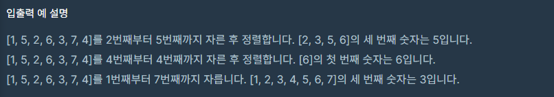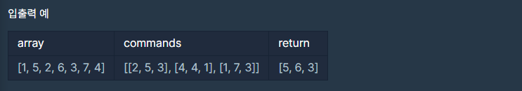 배열 array, [i, j, k]를 원소로 가진 2차원 배열 commands가 매개변수로 주어질 때, commands의 모든 원소에 대해 앞서 설명한 연산을 적용했을 때 나온 결과를 배열에 담아 return 하도록 solution 함수를 작성해주세요.